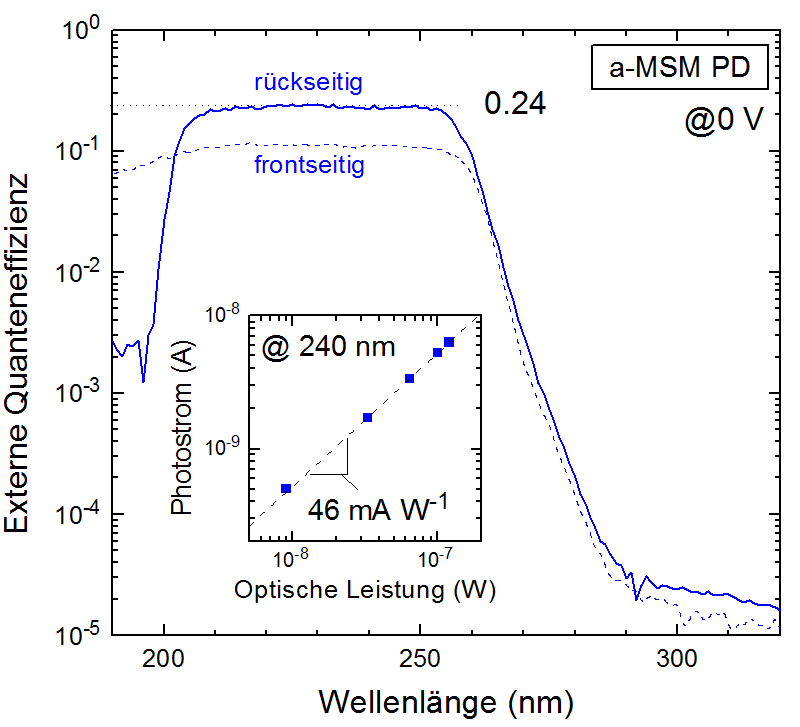 Eine nur 100 nm dünne Al0,5Ga0,5N-Absorberschicht wird mittels metallorganischer Gasphasenepitaxie auf einem AlN-Puffer auf Saphir-Substrat aufgebracht (Abb. 1a). Auf dem Absorber werden auf 400 µm x 400 µm Detektorfläche 2 µm breite Elektroden im Abstand von je 2 µm in zueinander koplanarer Kammgeometrie prozessiert (Abb. 1b). Der eine Elektrodenkamm basiert dabei auf Ni, das bei 800°C formiert wird und einen Ohm‘schen Kontakt bildet. Der anschließend aufgebrachte Pt-basierte Elektrodenkamm bildet den Schottky-Kontakt. Durch diese Asymmetrie kann auch ohne Vorspannung ein Fotostrom fließen. Bei rückseitiger Bestrahlung des a-MSM-Detektors ohne Vorspannung ergibt sich eine nahezu konstante EQE von 24 % unterhalb von 250 nm bis ab ca. 210 nm die Absorption in der AlN-Pufferschicht einsetzt (Abb. 2). Der Fotostrom hängt dabei linear von der optischer Eingangsleistung ab (Insert). Die EQE unter frontseitiger Bestrahlung ist wegen der Abschattung in diesem Bereich nur halb so hoch.