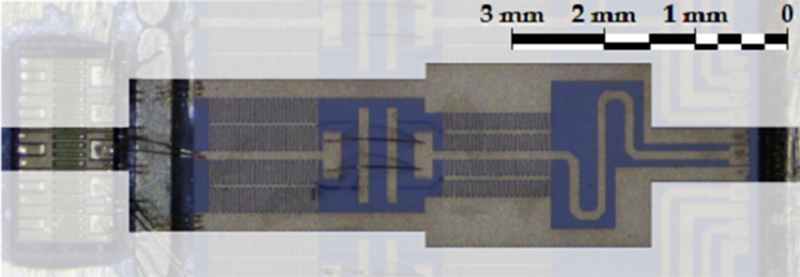 Das Prinzip eines Netzwerks in π-Topologie, welches mit dem Transistorausgang integriert wurde, wird in Abb. 1 gezeigt. Es wurde auf einem einzelnen BST-Keramiksubstrat realisiert, wobei die Kapazitäten C1 und C2 spannungsgesteuerte, planare interdigitale BST-Varaktoren sind. Die Induktivität L ist mithilfe von zwei parallelen 1 mm langen und 25 µm dicken Bonddrähten realisiert. Die Steuerspannung des Varaktors ist durch die Verwendung von antiseriellen Varaktorpaaren und hochohmiger Zuführung der Vorspannungen entkoppelt. Abb. 2 zeigt den hergestellten Aufbau für eine einzelne Zelle und Abb. 3 die Konfiguration für einen diskreten, in der Last abgleichbaren Powerbar mit fünf Zellen.