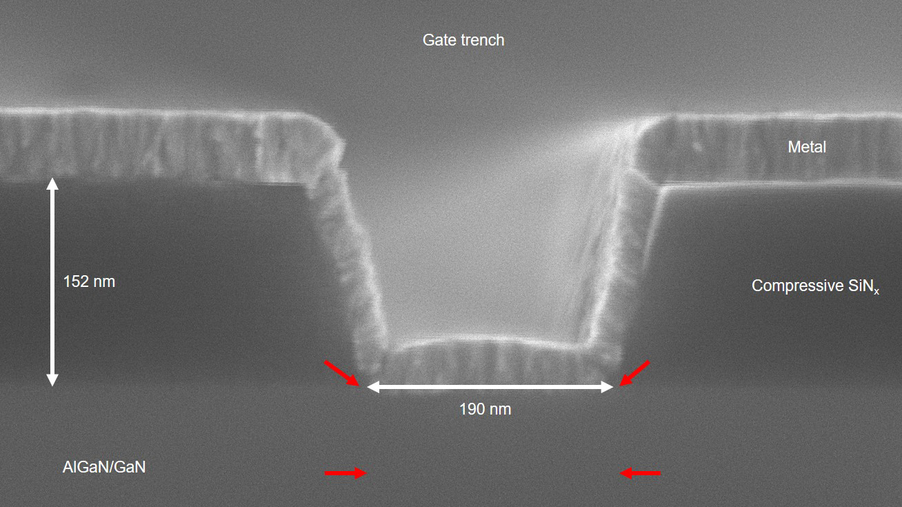 Fig. 1: SEM cross section image of an AlGaN/GaN- SiNx stack with a gate trench etched through the compressively stressed SiNx and a metal layer on top. The red arrows mark the stress direction within the SiNx and the strain direction within the AlGaN/GaN layers.