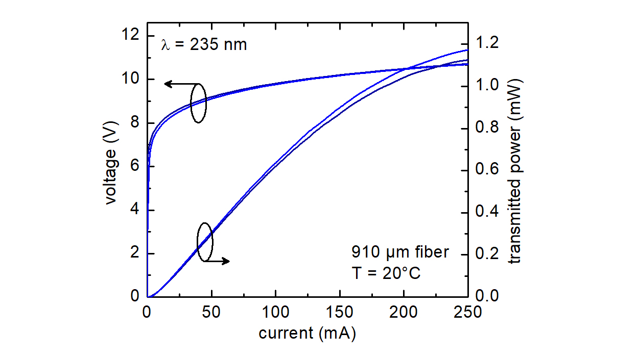 By further improving the technology, it was possible to integrate 125,000 closely packed circular micro-LEDs, each with a diameter of less than 1.5 µm, into a single 1 mm x 1 mm LED chip. At a drive current of 200 mA, more than 1 mW optical power at a wavelength of 235 nm was transmitted through a 1 m long fiber with a core diameter of 910 µm (Fig. 3). Partners at Charité Berlin predict that this power level should be sufficient to achieve disinfection of the human throat in less than 5 minutes, paving a new path for the eradication of multi-drug-resistant germs.