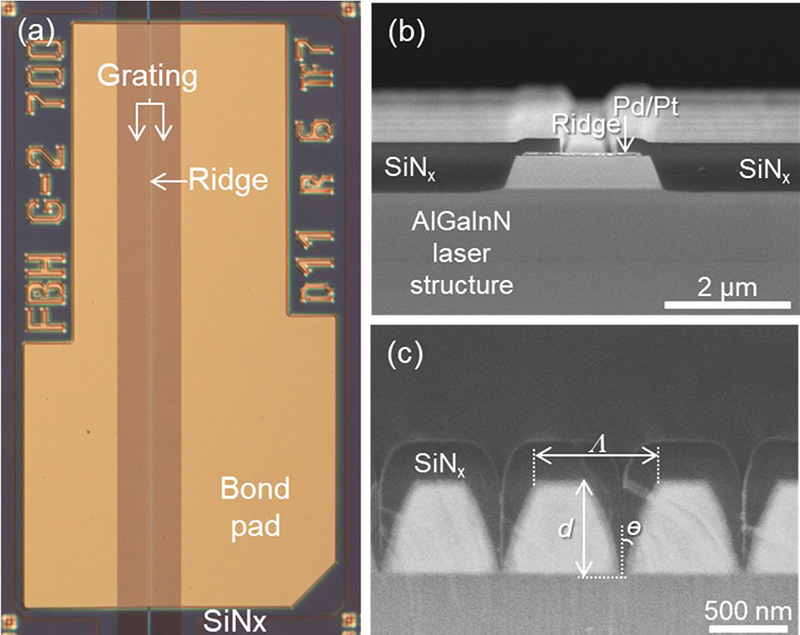 However, the realization of low-order (1st, 2nd, or 3rd-order) Bragg gratings is technically challenging due to the short emission wavelength and the resulting small dimensions of the gratings. To overcome this difficulty, the concept of 10th-order laterally coupled (LC) surface Bragg gratings with V-shaped grooves was recently proposed by FBH. Within the Joint Lab GaN Optoelectronics an optically pumped LC-DFB laser based on GaN was demonstrated [1].