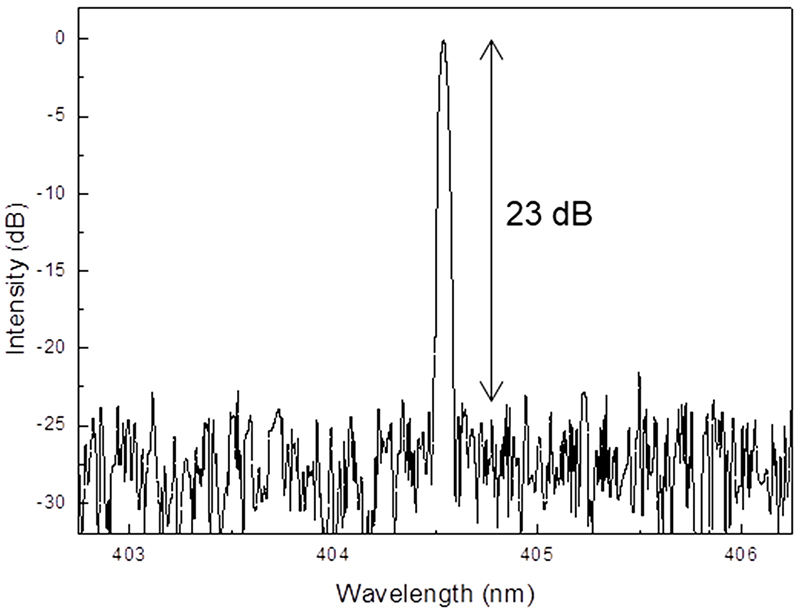 Distributed feedback (DFB) laser diodes (LDs) emitting in the blue-violet spectral region are promising light sources for spectroscopy, atomic clocks, and medical applications, requiring a stable emission wavelength and a narrow linewidth.