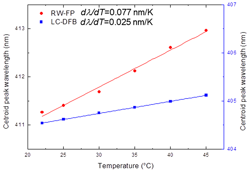 The results clearly show that the high-order laterally coupled gratings act as wavelength-selective elements. Moreover, the shift of the lasing wavelength with temperature of the LC-DFB LDs was around three times smaller than that of RW-FP LDs (see Fig. 3). The low sensitivity of LC-DFB LDs to temperature results from the coupling of the optical mode to the grating, i.e. the shift of the emission wavelength mainly emerges from the temperature dependence of the effective refractive index of the optical mode rather than the shift of the gain maximum. Moreover, the LC-DFB LDs showed a clear single peak emission for the entire temperature range from 22 °C to 45 °C.