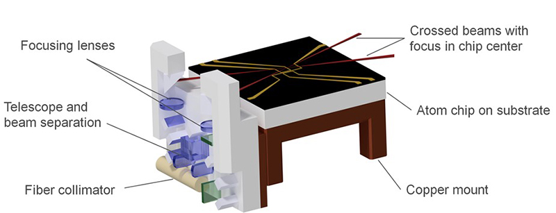 A prototype design of a crossed beam ODT next to an atom chip assembly is depicted in Fig. 1. After a polarization-maintaining, single-mode fiber collimator, 1064 nm light is guided into a beam conditioning system, where the diameter is increased from 600 µm to 2 mm using a telescope. Subsequently, the beam is separated into two orthogonal polarized parts with equal intensity. In both beams a spherical focusing lens with 35 mm focal length is used to realize the crossed beam close to the atom chip surface. With the size and geometry shown, the setup can be mounted to the side of an atom chip assembly and thus inside a compact UHV system. Within the chip center, the beams have a waist radius of 20 µm and form a crossed beam ODT with an incidence angle of 45°. In order to realize such a design, established integration technologies at FBH will be used.