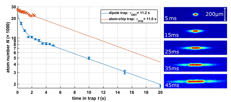 Conceptual studies on the preparation and manipulation of a BEC in a hybrid trap geometry consisting of an atom-chip trap and a single beam ODT in a cage-system based setup have been carried out in a project within the QUANTUS („Quantengase unter Schwerelosigkeit“) collaboration. Fig. 2 shows absorption images of a BEC initially prepared inside the magnetic atom-chip trap and after lossless transfer into a single-beam ODT for all-optical trapping. Right after switching off the magnetic fields, the BEC starts propagating inside an optical waveguide-like configuration alongside the propagation of the dipole beam. Lifetime measurements of the optically trapped atoms reveal a 1/e lifetime of 10 s comparable to the magnetically trapped atoms for holding times larger than 1 s. With no evidence for atom losses imposed by the trapping laser, these results underline the importance of low outgassing components and assembly techniques for in-vacuum realizations as residual atoms in the background gas being the limiting factor.