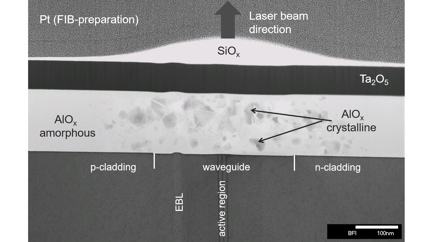 We observed that this effect depends to a large extent on the material of the top facet coating layer. To counteract it, we tested different materials as a top facet coating layer, namely TiO2, Ta2O5, Al2O3, and SiO2. However, when these laser diodes were operated in the presumably Si-containing laboratory atmosphere, a SiOx layer still formed on the facet. We are currently investigating a suitable coating material in combination with a hermetic encapsulation in the TO housing to effectively prevent this effect.