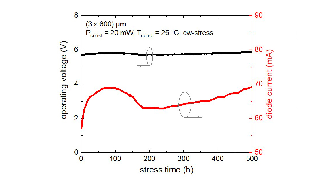 At FBH, we develop GaN-based single-mode ridge waveguide laser diodes in the blue-violet spectral range. Our devices have already achieved lifetimes of more than 10,000 hours at a constant output power of 20 mW. This potentially enables a wide range of applications, such as high-resolution spectroscopy, laser displays, biophotonics, and external-cavity diode laser. However, real-world applications require not only failure-free operation but also stable performance. Especially in complex optical systems, consistent operating current and beam characteristics are essential. We have identified a facet degradation mechanism which affects both aspects. In order to understand and finally mitigate this effect, we have carried out extensive aging studies combined with material analyses.