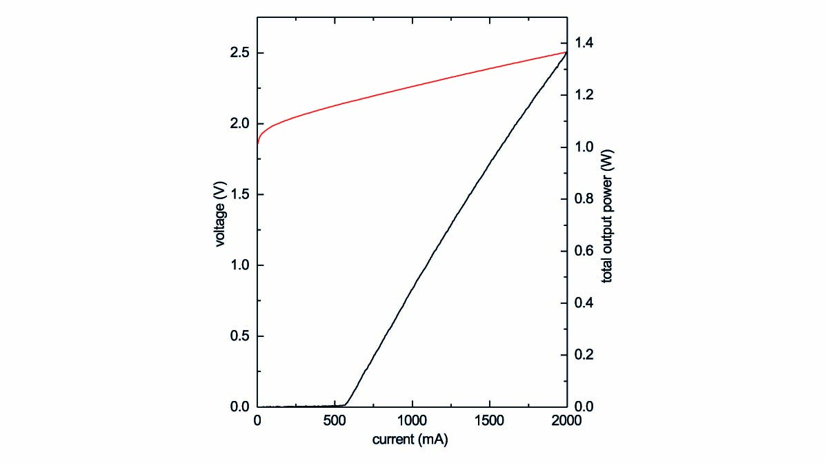 Our approach at FBH is to extend the emission range of GaAs-based lasers from 633 nm down to the above-mentioned wavelengths of interest. First, we focused on developing epitaxial laser structures with a gain maximum at 626 nm. This allows us to fabricate seed lasers and amplifiers for master-oscillator power-amplifier setups and spectrally stabilized lasers. For this, we performed detailed theoretical investigations to find the best-fitting layer structure [1]. This structure was then grown by metal-organic chemical vapor phase epitaxy on three-inch-wide wafers. The final broad area lasers emitted under pulsed excitation having a total maximum power of close to 1.4 W at 625 nm, reaching peak efficiencies of approximately 30 %.