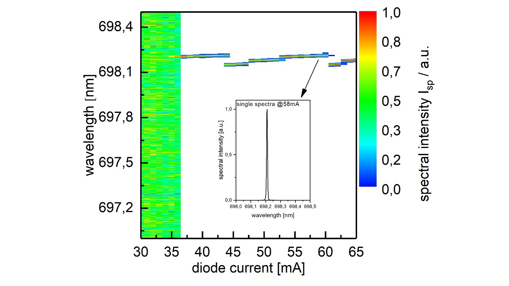 Rather than following the traditional full space-certification path, we adopted the “new space” philosophy focused on efficient development. Commercial off-the-shelf components were purchased in sets, allowing parallel qualification. The qualification process comprised four tests: vibration and shock tests simulating the conditions of a Falcon 9 transport, a 48-hour thermal-vacuum cycle between 0 °C and 40 °C, and a 20-hour radiation exposure at 10 Gy/h, accumulating a total dose of 200 Gy – roughly fifty times the dosage expected during one year in orbit. Fig. 3 shows the spectral behavior of a laser device for different currents after the qualification: all components retained functionality as an ECDL, and no damage occurred during the tests. Following qualification, we housed the components in a titanium base to ensure alignment. Additionally, we designed a 3D-printed aluminum cover to protect the unit.