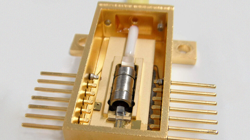 Zu diesem Zweck hat das FBH im Rahmen des Projektes FINDLING [3] ein entsprechendes Lasermodul entwickelt. Das Modul besteht aus einer Laserdiode, einem miniaturisierten optischen Isolator (µ-Isolator), Kopplungsoptiken und einem polarisationserhaltenen Faserausgang (PM-Faser) (siehe Abb. 1).