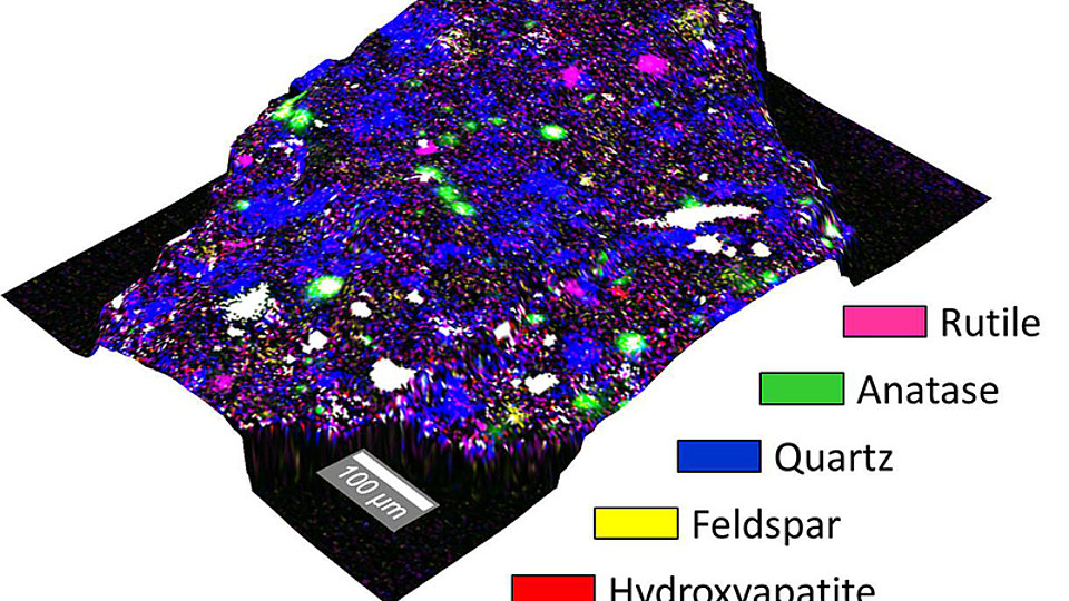 To this end, confocal Raman microscopy measurements were performed in conjunction with our SERDS experiments to generate a better understanding of soil properties, e.g. the heterogeneous distribution of target substances. As the investigated area for each measured point is about 1 µm2, spatially resolved Raman spectra of individual soil constituents can be obtained. Fig. 1 shows a 3D false-color Raman image of the sample surface. Contributions of rutile, anatase, quartz, feldspar and our target analyte hydroxyapatite can be seen.