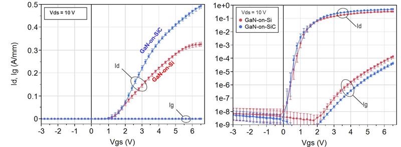 Abb. 2: Eingangskennlinie (Waferverteilung, Median, Percentilen) für GaN-auf-Si- und GaN-auf-SiC-Transistoren mit 3,2 mm Gateweite – lineare (l.) und logarithmische (r.) Darstellung