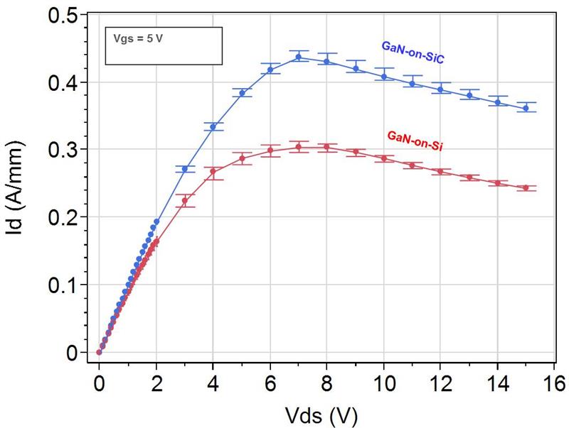 Signifikante Unterschiede zwischen den eingesetzten Substraten zeigen sich aber beim Betrieb mit Verlustleistung. Der maximale Drainstrom der GaN-auf-Si-Transistoren (Idsmax = 0,3 A/mm bei Vds = 7,5 V) liegt bei nur 68% des Stroms der GaN-auf-SiC-Bauelemente. Der geringere Strom kann nur teilweise durch den um 20% höheren Schichtwiderstand des Transistorkanals für den GaN-auf-Si-Wafer erklärt werden. Dieser spiegelt sich nur im unterschiedlichen Einschaltwiderstand der Leistungsschalttransistoren (59 mΩ für GaN-auf-SiC und 67 mΩ für GaN-auf-Si-Transistoren bei 214 mm Gateweite) wider. Die wesentliche Ursache ist vielmehr die erhöhte Kanaltemperatur der GaN-auf-Si-Transistorzellen wenn 7 W und mehr elektrische Leistung auf 0,1 mm2 aktiver Transistorfläche umgesetzt werden müssen. Hier zeigt sich, dass SiC-Substrate mit ihrer im Vergleich zu Silizium dreimal höheren Wärmeleitfähigkeit die Verlustwärme schneller abführen können. Nach dem Abdünnen der Wafer und dem Vereinzeln und Einhäusen der Transistorchips wird sich der Einfluss des Substratmaterials auf die Kanaltemperatur verringern.