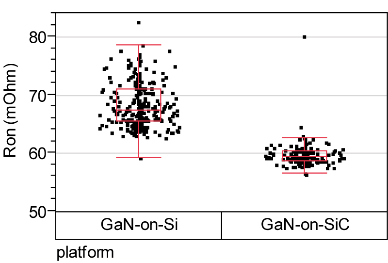 Abb. 3: Ausgangskennlinie (Waferverteilung, Median, Percentilen) für eingeschaltete GaN-auf-Si-und GaN-auf-SiC-Transistoren mit 3,2 mm Gateweite
