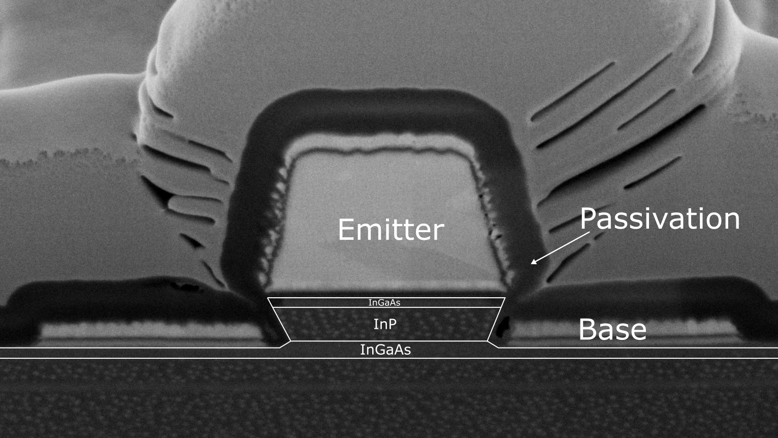 The aggressively scaled nature of this layer, which improves device performance by reducing base recombination current, necessitates the fabrication of high-quality InGaAs/passivation interfaces. Undefined surface states and defects at this interface will reduce the HBT performance by increasing recombination rates, including compensation effects, and raising the base resistance.