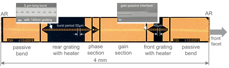 Widely tunable diode lasers are key components for optical systems for industrial and biomedical sensor applications. Preferred devices should be robust without any moving parts and allow wavelength tuning only with control of the driving currents. Nowadays, sampled grating (SG) distributed Bragg reflector (DBR) lasers based on InP are well established and offer wide wavelength tuning around 1.3 µm and 1.55 µm. This is in contrast to the short wavelength GaAs material system where the integration of gratings with reduced periods and very high coupling coefficient is challenging.