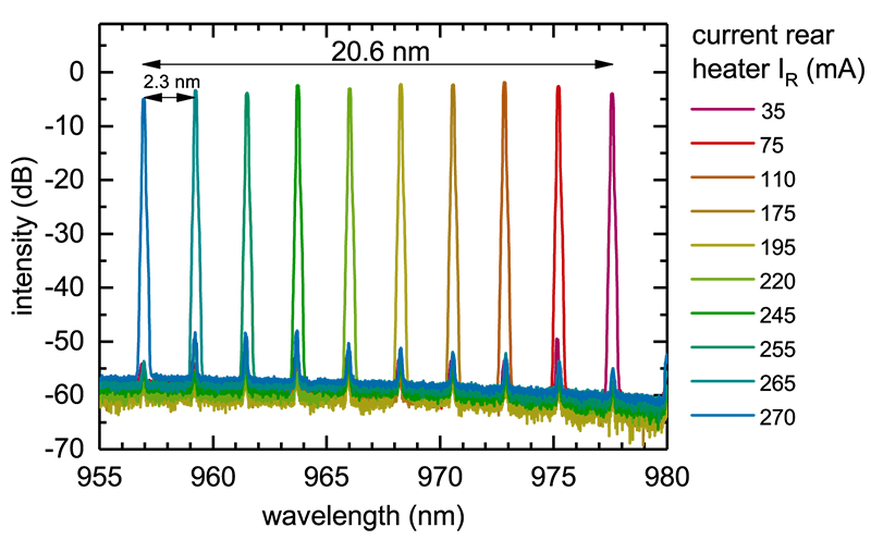Recently we have realized a GaAs-based SG-DBR laser (Fig. 1). The device has a novel vertical layer structure which is grown in two steps by metal-organic vapor phase epitaxy. The structure allows the integration of gratings with very high coupling coefficient while keeping the oxygen incorporation at the regrowth interface at a low level. An InGaAs quantum well (QW) is asymmetrically embedded in GaAs confinement and AlGaAs cladding layers. The first epitaxy stops after the growth of the first part of the p-confinement layer above the QW. The n-confinement layer beneath the QW contains two InGaP layers acting as etch stop and grating layers. Placing the grating layer near the intensity peak of the vertical mode ensures a high coupling coefficient. Two lithographical steps, each followed by selective wet etching, are performed before overgrowth. Grating bursts with a length of 5 µm were defined with Ebeam (Vistec SB251), repeated with periods of 50 µm and 45 µm for the rear and front grating, respectively. Within a burst, the gratings have a period of 140 nm and a duty cycle of 50%. After completing the second epitaxy a standard ridge waveguide laser fabrication process follows. Fig. 2 summarizes measured wavelengths in dependence of the currents applied to the front and rear heater sections. Stripes of similar colors indicate areas of the same Vernier mode. The SG-DBR emits ten Vernier modes around 970 nm and continuous tuning of a single mode can be achieved if both heater currents are controlled simultaneously. The optical spectra for a fixed front heater current of 250 mA are summarized in Fig. 3. The spacing between two Vernier modes is 2.3 nm, and the spectral distance between the first and the tenth mode is 20.6 nm (side mode suppression > 40 dB).