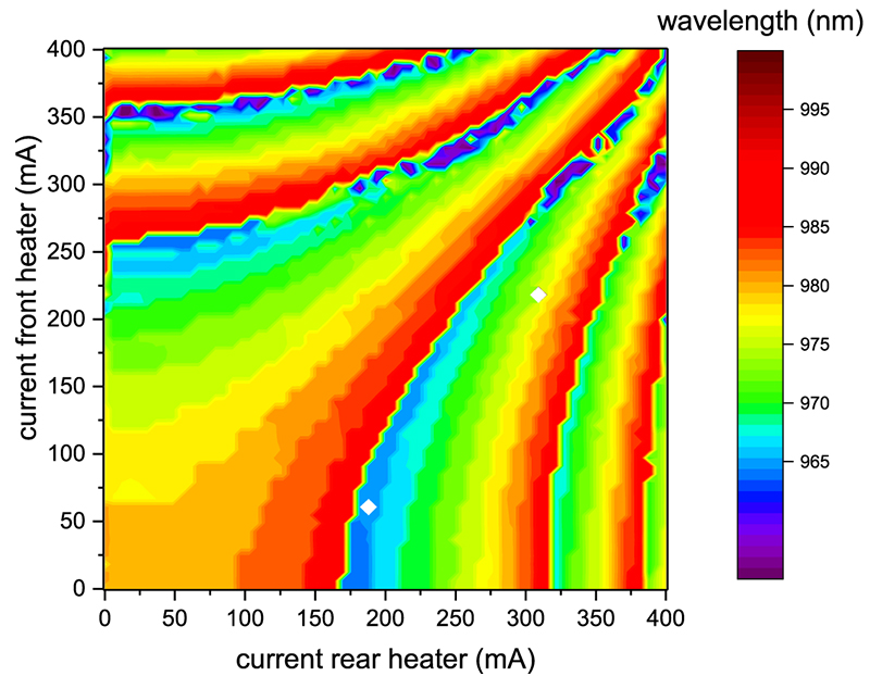 Fig.2: Measured laser wavelengths in dependence of the currents applied to the rear and front heater (current gain section 150 mA, C-mount temperature 20°C)