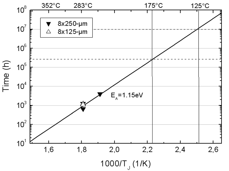 Abb. 1: Mittlere Ausfallzeit (mean-time to failure MTTF) als Funktion der Kanaltemperatur während Lebensdauertests bei Drain-Spannung von 30 V und Kanaltemperatur von 250°C (2 Transistoren 8x250 µm) bzw. 280°C (jeweils 2 Transistoren: 8x250 µm und 8x125 µm).