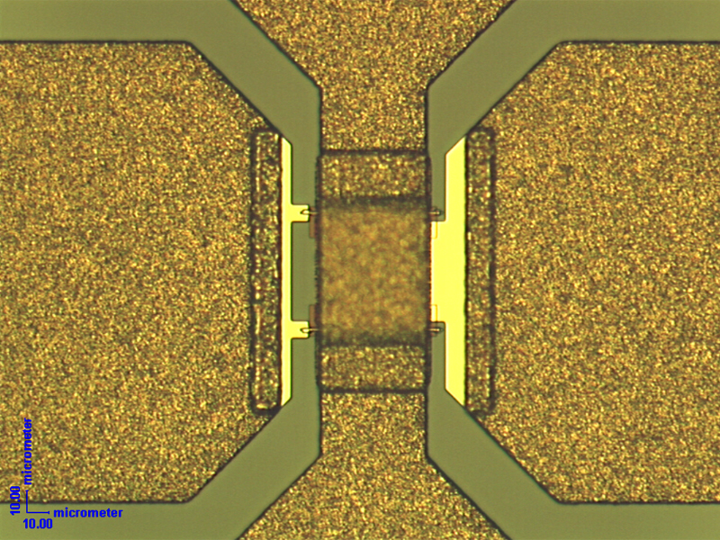 Nachdem das FBH seinen stabilen und reproduzierbaren GaN-HEMT-Prozess erfolgreich demonstriert hatte, wurde dem Institut angeboten, Bauelemente für ein Experiment an Bord des Kommunikationssatelliten Alphasat zu liefern [3]. Ziel dieses Experiments ist der Test von Bauelementen ausgewählter europäischer Hersteller unter realen Weltraumbedingungen, insbesondere die Untersuchung ihres Verhaltens gegenüber kosmischer Strahlung. Für das von der Universität Aveiro und von EFACEC (beide Portugal) entworfene Experiment fertigte das FBH speziell optimierte GaN-Bauelemente. Diese wurden in ein 2 GHz-Oszillatorexperiment integriert, das nach dem Erreichen des Weltraums in geostationärer Umlaufbahn die Fernabfrage seiner eigenen Parameter wie z.B. Ausgangsleistung oder DC-Stromänderungen ermöglicht [4]. Abb. 2 zeigt die mikroskopische Aufnahme eines der gelieferten Transistoren.