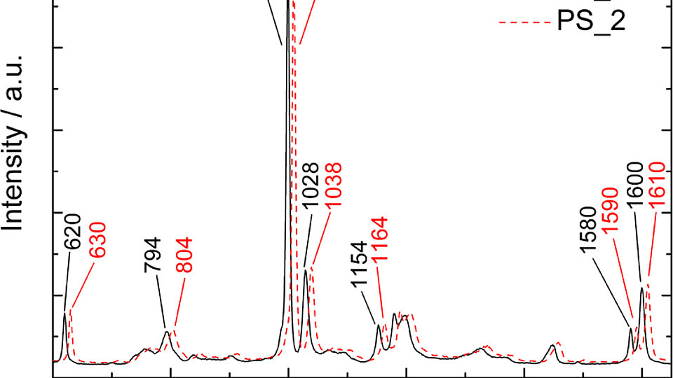 Die Anwendbarkeit dieser Diodenlaser wurde mit deren Einsatz als Anregungslaser in Raman-spektroskopischen Untersuchungen verifiziert. Raman-Spektren von festem, transparenten Polystyrol sind mit beiden Laserkavitäten eines Zwei-Wellenlängen-Diodenlasers erzeugt worden und im spektralen „Fingerprint“-Bereich in Bild 3 dargestellt. Die x-Achse (Raman Shift) ist hierbei auf die Raman-Signale von PS_1 und deren Literaturwerte spektral kalibriert. PS_2 wurde mit der zweiten Laserkavität angeregt. Das Raman-Spektrum von PS_2 zeigt hierbei die angestrebte spektrale Verschiebung von 10 cm-1.