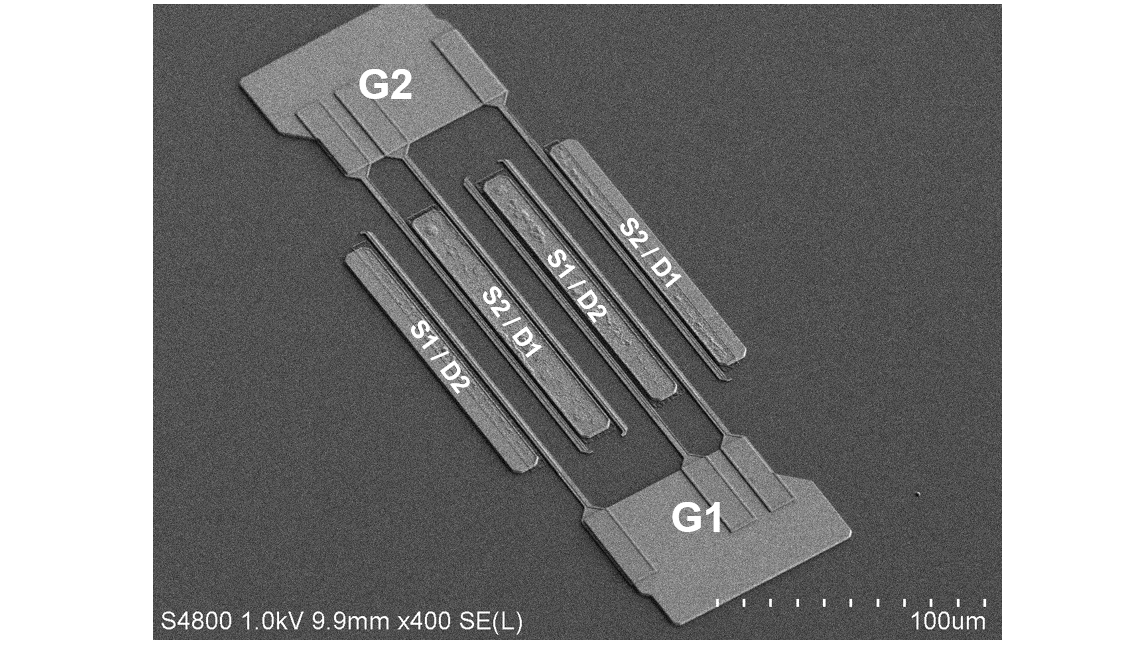 Rasterelektronenmikroskopische Aufnahme einer bidirektionalen Transistorstruktur mit Source-, Gate- und Drain-Metallisierungen