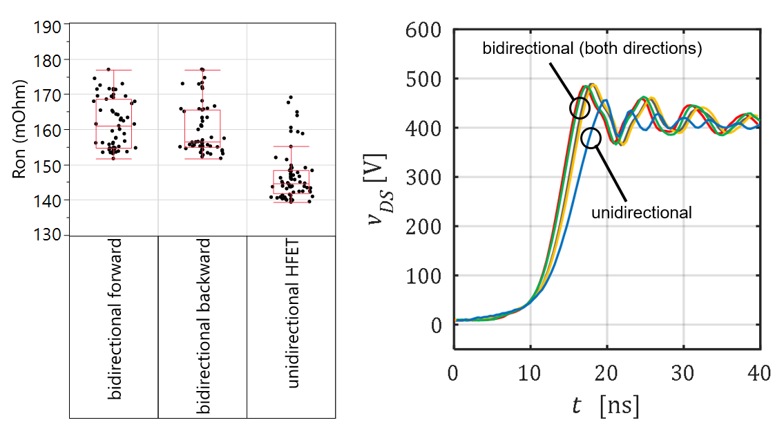 Am FBH prozessieren wir uni- und bidirektionale Transistorvarianten zusammen auf einem Wafer. Bei gleicher Gateweite und gleichem Source-Drain-Abstand ist die Sperrspannung identisch und der Einschaltwiderstand der bidirektionalen Variante ist nur um etwa 10% größer als für die unidirektionale Variante. Das Schaltverhalten der bidirektionalen Transistoren ist in beide Betriebsrichtungen gleich.