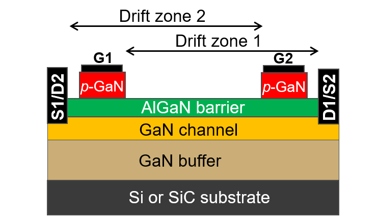 Mit lateral aufgebauten, unipolaren 600 V GaN-Transistoren hingegen lässt sich die bidirektionale Funktionalität einfach realisieren, indem in der Driftstrecke ein zweites Gate integriert wird. Die Driftstrecke zwischen den Gates wird dann in beiden Betriebsrichtungen genutzt. Dies erhöht den Einschaltwiderstand nur minimal gegenüber der unidirektionalen Variante.