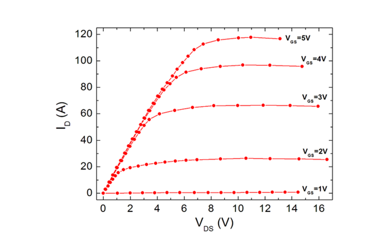 Unsere 600 V Schalttransistoren können bei 60 mOhm Einschaltwiderstand einen maximalen Pulsstrom von über 100 Ampere liefern und eignen sich für den Konverterbetrieb im Kilowattbereich. Die Transistorkapazitäten und insbesondere die Gateladung sind deutlich kleiner als für entsprechende Silizium-basierte Bauelemente. Die Schalttransienten beim Doppelpulstest mit induktiver Last zeigen für hartes Schalten hohe Strom- und Spannungssteilheiten und ermöglichen so besonders kurze Schaltzeiten mit geringen Schaltverlusten.
