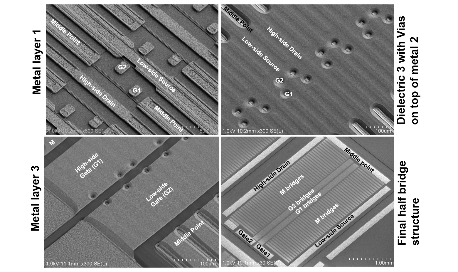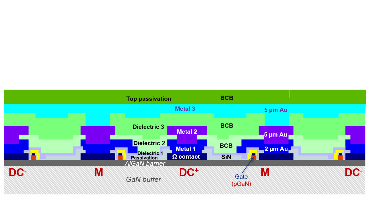 Zwei Hochstrom-Metallebenen aus 5 µm dickem galvanisch abgeschiedenem Gold ermöglichen zusätzlich zu diskreten Schalttransistoren einen monolithischen Aufbau von besonders kompakten Halbbrückenstrukturen. Als hochspannungsfestes Dielektrikum setzen wir Benzocyclobutene (BCB) ein, mit dem wir auch die GaN-Chips final verkapseln. Vias in den SiN- und BCB-Schichten verbinden die einzelnen Metallebenen elektrisch miteinander.