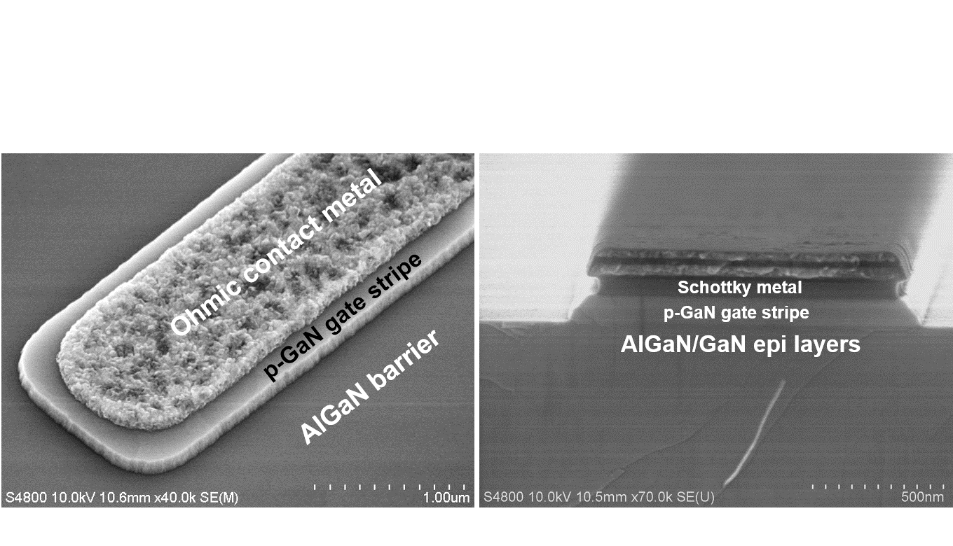 Durch ein p-GaN-Gatemodul werden die intrinsisch selbstleitenden GaN-Transistoren in selbstsperrende Bauelemente umgewandelt. Dabei setzen wir p-GaN-Gates mit ohmschen Gatekontakten oder mit Schottky-Typ-Gatekontakten ein. Die Transistoren prozessieren wir auf 4-Zoll GaN-auf-Si- oder GaN-auf-SiC-Wafern mittels i-line Stepperlithografie. Die größten Transistoren der 650 V Klasse haben um die 60 mOhm Einschaltwiderstand und schalten Ströme von typischerweise 10 - 20 A.