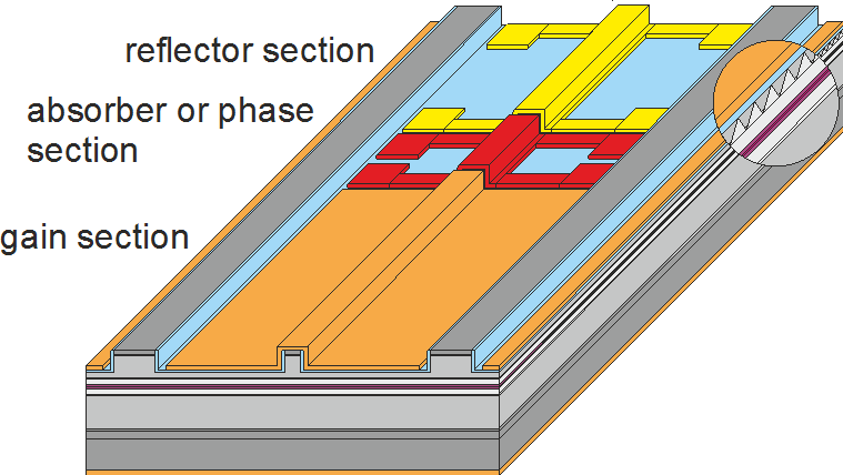 - der DBR-Sektion, in der ein internes Bragg-Gitter als wellenselektiver passiver Reflektor wirkt