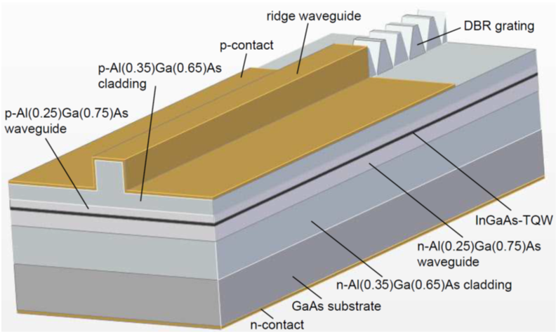 - Nach dem ersten Epitaxieschritt: Einbringen eines Bragg-Gitters zur Frequenzstabilisierung mit holografischer Lithografie und nasschemischem Ätzen in den Wellenleiter