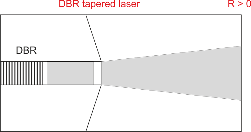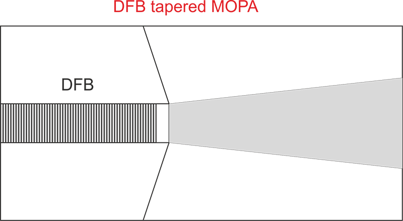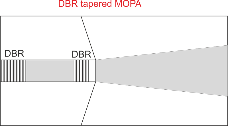 Wird ein weiteres passives Bragg-Gitter am vorderen Ende der RW-Sektion beim Übergang zur Trapezsektion eingefügt, so arbeitet die RW-Sektion als selbständiger DBR-Laser (b). In diesem sogenannten monolithisch integrierten MOPA (Master-Oscillator-Power-Amplifier), wird das vom DBR-Laser erzeugte Laserlicht in der Trapezsektion verstärkt. Für einen stabilen Betrieb ist eine gut entspiegelte Facette an der Trapezsektion notwendig.