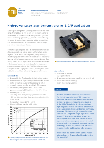 Mit seiner PLS-Reihe bietet das FBH sehr effiziente, gepulste Laserstrahlquellen, die auf selbst entwickelten optischen und elektronischen Halbleiterkomponenten basieren. Das All-in-One-System besteht aus einem modengekoppelten Laser, einem innovativen Pulspicker-Element sowie einem optischen Verstärker. Die Laserquelle eignet sich ideal für Anwendungen als Seed-Laser in der Materialbearbeitung, vor allem in Verbindung mit Faserverstärkern.