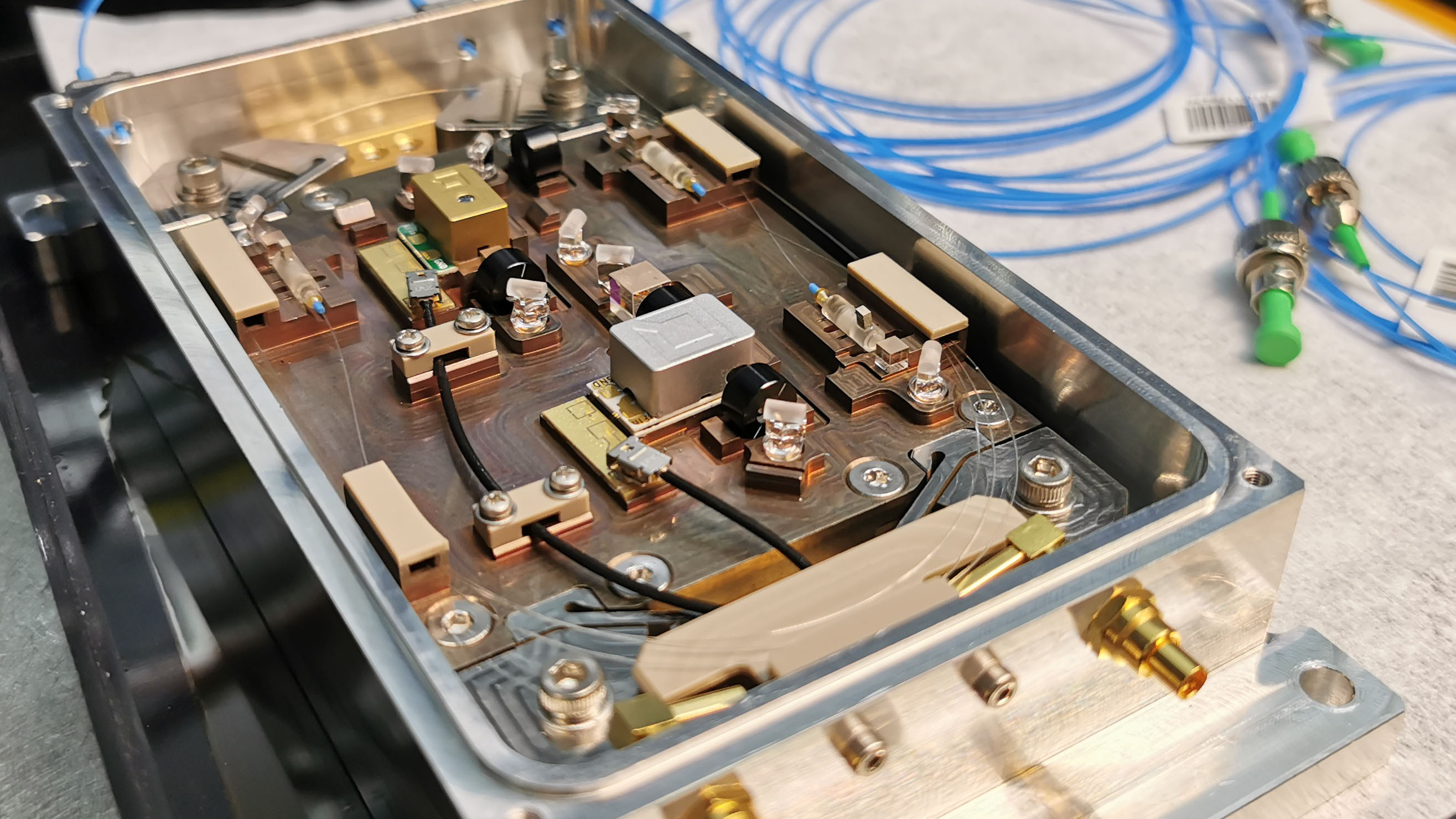 To leverage their precision in challenging environments – whether in the field or in space – transportable optical clock systems have to meet stringent size, weight, and power (SWaP) requirements across all components. At FBH, we address the miniaturization of the required laser systems through hybrid micro-integration of compact, ultra-narrow linewidth diode laser modules and additional light control units (LCUs). These modular LCUs are equipped with ultra-compact free-space acousto-optic and electro-optic modulators. They enable power switching, frequency shifting, and amplitude or phase modulation of optical signals to condition the light before it interacts with the atomic system of the optical clock.