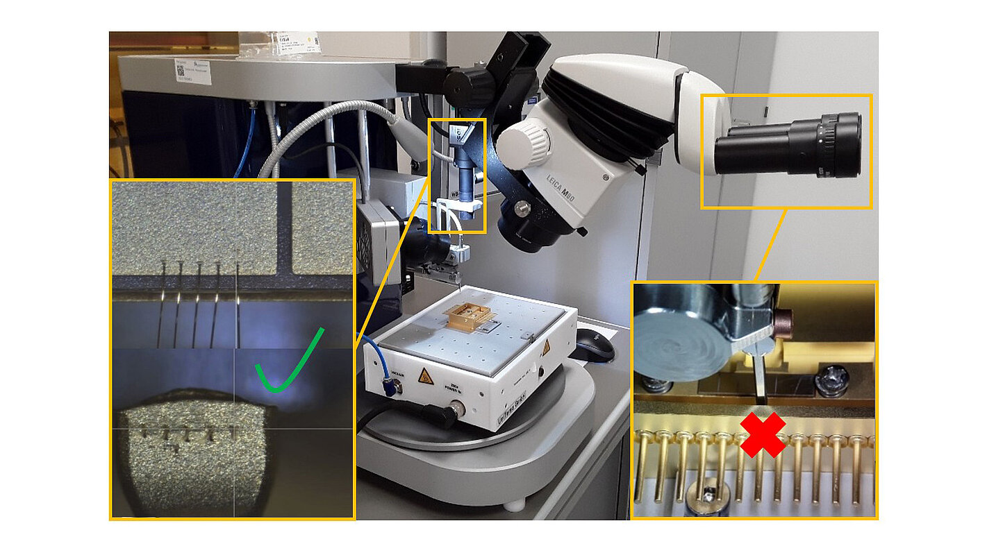 Our new semi-automatic wire bonder combines the advantages of both existing systems. Together with the manufacturer, we further developed and optimized it to meet our specific R&D requirements. The system now allows flexible and rapid wire bonding without the need for time-consuming program creation. With a live image view on a PC screen, precise placement of wire bonds even in areas with visibility restrictions can be assured, which was not possible with our previous manual and semi-automatic systems. Fig. 2 demonstrates the benefit of using a coaxial camera system: with a conventional microscope, wire bonding is not possible because the housing wall obstructs the view of the bonding tool. The coaxial camera, however, enables a direct view of both the pin and the PCB. By aligning the bonding tool with the integrated crosshair – indicating its exact center – wire bonds can be placed with micrometer accuracy. Fig. 3 shows the resulting wire bonds from pin to PCB, successfully executed using this system.