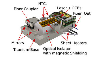 The optical design consists of a 698 nm external-cavity diode laser (ECDL) coupled through an isolator into a polarization-maintaining fiber (see Fig. 2). Precision mirrors align the beam into the fiber under single-mode conditions, yielding up to 12 mW of linearly polarized output. This straightforward layout minimizes alignment complexity and facilitates quick assembly. Miniaturization of the laser system was also facilitated by utilizing FBH’s micro-isolator technology developed for space applications.