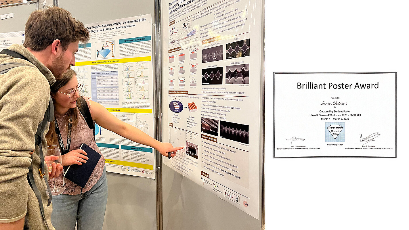 Ihr prämiertes Poster trägt den Titel „Towards Reliable Quantum Photonics: Controlling Hard Mask Stability and Plasma Etching in Diamond Nanofabrication”.